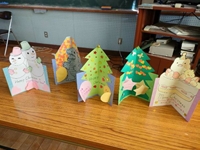 「クリスマスのポップアップカード」とは、カードを開くとツリーまたは雪だるま等、デザインした絵柄が飛び出すポップアップカードです。カードには、シールを貼って飾り付けをし、クリスマスのメッセージを書きました。子どもたちは飛び出すカードの仕掛けに苦心しながらも思い思いに大切な人へのメッセージを書いて素敵なカードを見事に作っていました。