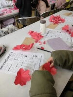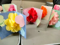 「お祝いの花咲く仕掛けカード」とは、カードを開くと桜またはカーネーション等、デザインした花の絵柄が飛び出すポップアップカードです。カードには、シールを貼って飾り付けをし、メッセージを書きました。
